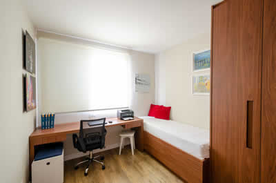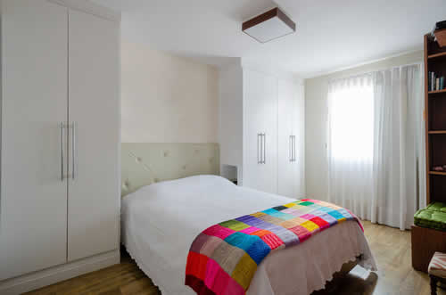 O dormitório não foi impactado por grandes alterações, apenas com o acréscimos de modulados para auxiliar o dia a dia da moradora | Projeto do escritório Trees Arquitetura | Foto: Ricardo Abreu