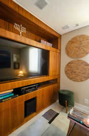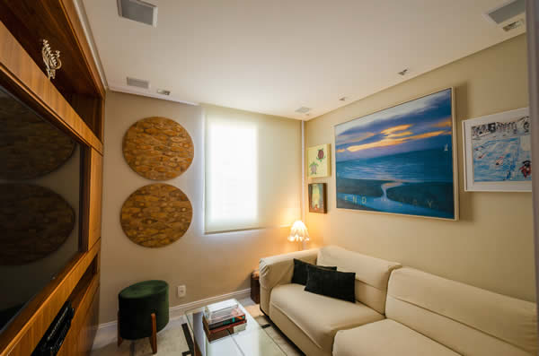 A sala de televisão é outro destaque e a arte se faz protagonista novamente, sendo responsável por emprestar cor e expressão ao espaço. As paredes foram pintadas na mesma cor do living, assim como o piso mantém a unidade nas áreas sociais. O painel da televisão preenche toda a parede e, assim como a mesa de centro, também presente na sala, foi desenhado pela dupla de profissionais para ser imponente e elegante. “Nossas principais estratégias foram pautadas na concepção e espaços modulados que propiciam a sensação de organização que tanto gostamos. Agora é possível guardar a maior parte dos objetos e aproveitar uma sessão de cinema de forma aconchegante”, lembra Eloy.