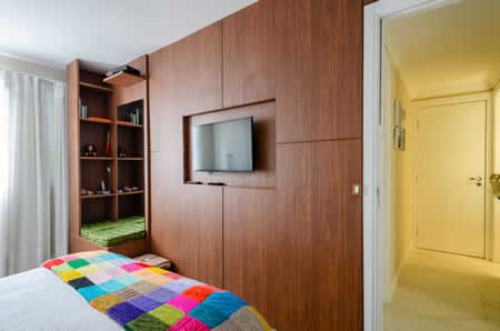 Para o quarto da moradora, o pedido foi simples: um espaço para usar como seu. Por isso, o grande painel de cumaru foi o responsável pela renovação visual e superfícies projetadas especialmente para acomodar itens, objetos pessoais e vestimentas da moradora, em substituição ao antigo armário