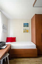 Com o aumento da atividade de trabalho em modalidade remota, a exigência de possuir um pequeno escritório em casa ficou em alta, e para essa moradora não foi diferente. Então, os arquitetos montaram um home office no quarto de hóspedes sem necessariamente perder todo o dormitório. A marcenaria bem elaborada para uma proposta multifuncional deu conta da bancada de trabalho, cama de solteiro e guarda-roupa.