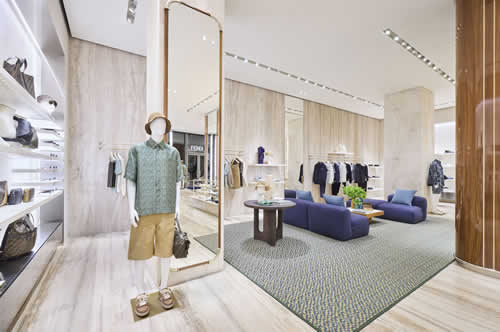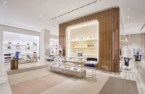 O universo FENDI se depara com tonalidades da Riviera Francesa em uma loja de 510 metros quadrados, onde coleções femininas e masculinas são apresentadas em uma atmosfera única. Desenvolvida em dois níveis, com o último andar com uma sala VIP e um terraço privativo no qual os hóspedes podem admirar a icônica vista da costa de Croisette. O conceito para o design da loja foi desenvolvido internamente pelo Departamento de Arquitetura da FENDI.