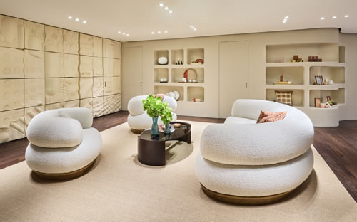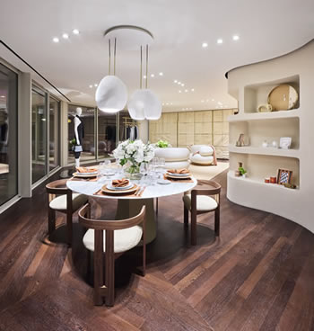 A parte feminina, onde estão localizados itens de ready-to-wear e calçados, é inspirada nas antigas texturas romanas, com paredes de travertino nervuradas, alternadas com nichos de padrão tridimensional de losangos. Uma aconchegante sala de estar brinca com tons quentes e naturais de uma mesa retangular de madeira de Maxime Delcourt, com banco travertino Eternity, de Arda Yeniay.