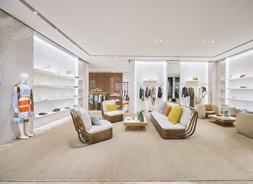 O espaço masculino se desdobra atrás do cubo central, apresentando uma seleção ready-to-wear e acessórios. Desenvolvidas em uma área do salão com mesa redonda de madeira, desenhada por Maxime Delcourt, as paredes nervuradas de travertino Ocean são colocadas em continuidade com o piso para criar um ambiente sofisticado.