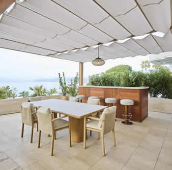 As amplas e arejadas janelas dão acesso ao terraço, no qual o piso é de ladrilhos quadrados de travertino e pergolado em madeira e tecido em tons neutros, que criam a sombra perfeita para receber convidados tanto durante o dia quanto à noite. Arranjos de essências mediterrâneas embelezam a área aberta e um balcão de bar em teca apresenta um motivo tridimensional inspirado no artesanato Astuccio.