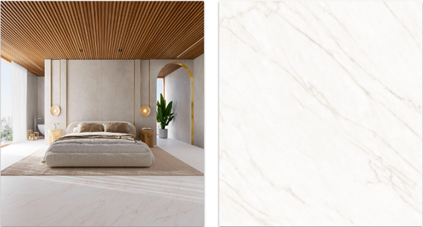 Da Série Alpe, lançamento da Roca Cerámica em 2024, a expressão do mármore Calacata Bianco disponíveis nos acabamentos Polido e Mate, tanto nos Superformatos (120 x 120 cm e 160 x 160 cm) como nos tradicionais tamanhos de 90 x 90 cm e 60 x 120 cm| Imagem: Divulgação Roca Cerámica
