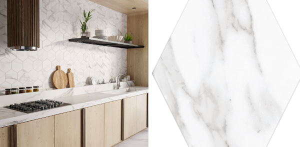 No frontão da cozinha, a aplicação da Série Calacata Light, da Roca Cerámica, que reproduz fielmente a estética da pedra natural na versão s e i sgonal de 20 x 23 cm e espessura de 7mm| Imagem: divulgação Roca Cerámica