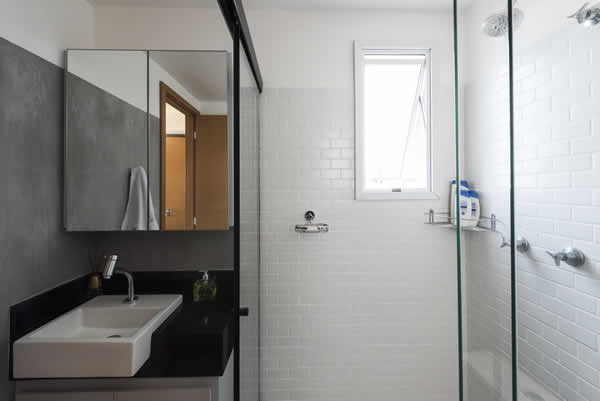 O banheiro da suíte segue o mesmo estilo industrial do apartamento. Mais uma vez o revestimento subway tiles, feito com pastilhas da Cerâmica Atlas, aparece nas superfícies. Para trazer mais bem-estar, o box foi ampliado. Um armário camuflado foi colocado atrás do espelho sobre pia, já que a mesma tem um espaço de apoio reduzido. Assim, os itens necessários possuem um lugar organizado.