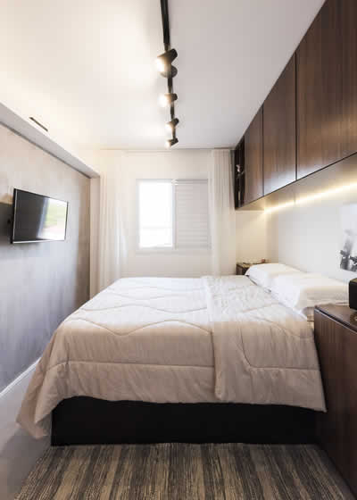 O quarto também precisou de uma atenção especial. O morador desejava ter uma cama queen size e isso poderia ocupar muito espaço, tornando o cômodo estreito. Como solução proposta pela arquiteta, foram posicionados foi dois guarda-roupas na vertical e na horizontal. Sobradando espaço para colar uma televisão na parede
