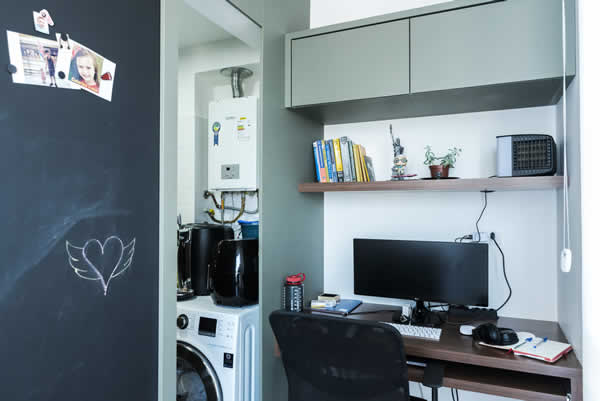 Home office e lavanderia separados por uma porta | Projeto da Panapaná Estúdio Foto: Rafael Roncato