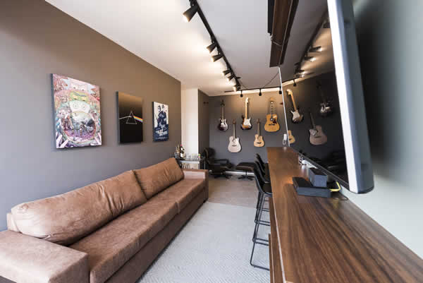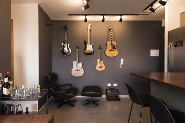 Em três meses de obra, entre marcenaria e decoração, a arquiteta conseguiu montar um projeto que combinasse todos os desejos do cliente. Tudo tinha lugar, mesmo com restrições. “Solucionamos esse problema otimizando cada canto de forma inventiva, com saídas personalizadas para os ambientes”, conta. Ao entrar no imóvel, a primeira mudança é uma parede com violões e guitarras, pendurados como se fossem obras de arte. Amante de música, o morador coleciona instrumentos e pediu um local especial para expor os instrumentos.