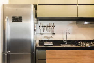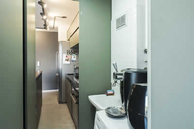 Apesar do espaço reduzido, a Panapaná desenvolveu soluções inteligentes para otimizar o uso da cozinha. Na bancada de pedra, uma torneira tipo monocomando tripla foi escolhida para economizar espaço, oferecendo água fria, filtrada e quente em uma única peça, com aquecimento a gás para reduzir o consumo de energia elétrica conforme solicitado pelo cliente. Um faqueiro na parede facilita o dia a dia na preparação das refeições. A geladeira de inox é suficiente para armazenar frutas, bebidas e alimentos do morador. O revestimento subway tiles contribui para a atmosfera industrial do apartamento.