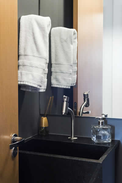 O lavabo, especialmente feito para receber as visitas, também passou por mudanças para acompanhar a paleta de cores do imóvel. O cômodo pequeno foi entregue com uma pia de piso padrão que destoava do restante da decoração, como solução para o problema o Panapaná projetou uma cuba inteira em granito preto, acrescentando charme ao espaço.