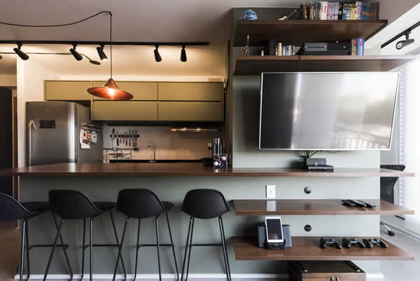 Apesar dos 45 m², a sensação de amplitude marca presença no projeto. Outro pedido do proprietário foi a criação de um carrinho de bar, posicionado estrategicamente ao lado do sofá pela arquiteta. A bancada de madeira da cozinha se estende até a sala, onde vira apoio para os aparelhos eletrônicos. Acima da televisão, prateleiras recebem os livros e objetos.