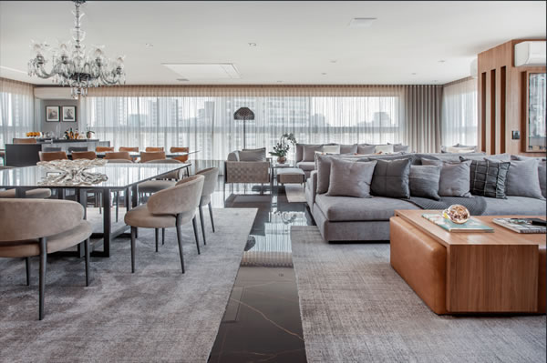 Antes consideradas como delimitadoras dos cômodos e importantes para o senso de privacidade, as paredes internas das áreas sociais seguem com os dias contados, pois a arquitetura convida as pessoas para viverem em ambientes mais abertos e conectados. Essa tendência não apenas amplia a percepção de espaço, como também facilita a comunicação e a interação entre os habitantes da casa. “A compartimentação já é considerada como fora de moda”, avalia Paula.
