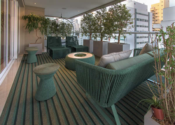 Na varanda desse apartamento, diversas espécies se mesclam com o mobiliário verde em corda náutica. E para tornar o ambiente perfeito para todas as épocas do ano, as arquitetas Danielle Dantas e Paula Passos ainda incluiu uma lareira ecológica na mesa de centro | Projeto do escritório Dantas & Passos Arquitetura | Foto: Maura Mello