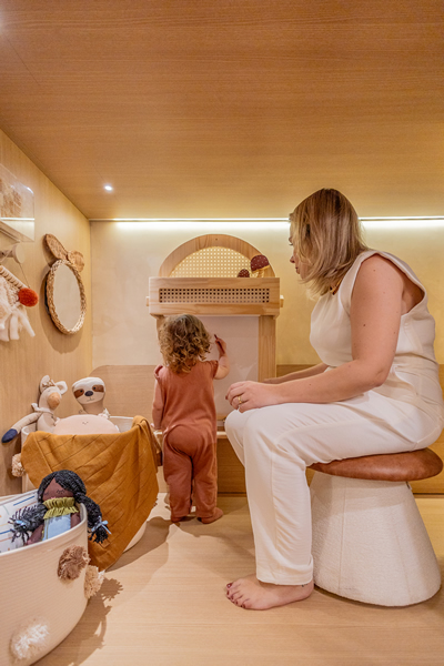Camila Vazquez arquiteta e a filha Gabi no ambiente Refugio para Gabi na CASACOR SP 2024. Foto: Amanda Bibiano | @ab_comunicacao