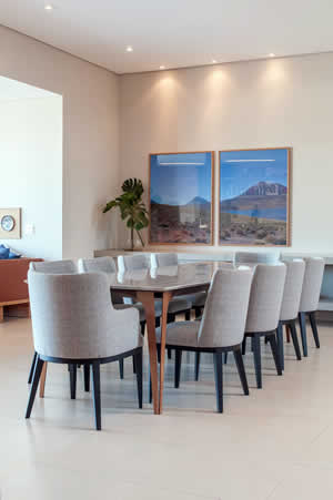 Nessa sala de jantar, as profissionais Vanessa Paiva e Claudia Passarini selecionaram uma mesa com estrutura de madeira e sua base de pedra lapidada executada sob medida | Projeto do escritório Paiva e Passarini Arquitetura | Xavier Neto