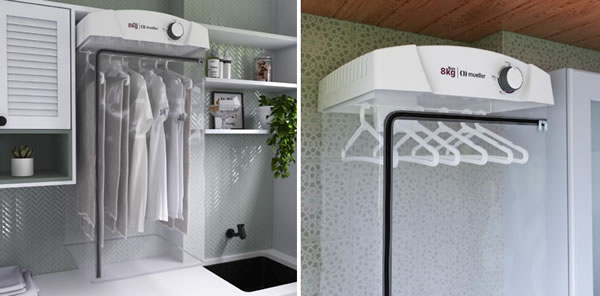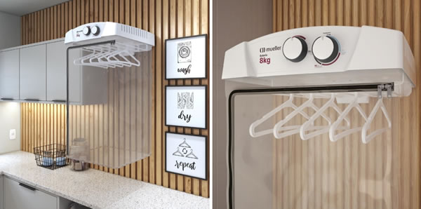 A Secadora de parede Mueller Sun 8kg é perfeita para todos os tipos de roupas e possui seis cabides para a secagem livre de marcas: é só tirar e levar direto para o guarda-roupas. A secadora Mueller Sun também possui timer de até 120 minutos e câmara de secagem com 90 cm de altura.