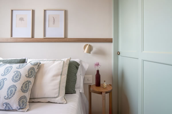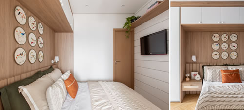 No dormitório da moradora, Daniela e Tatiana aproveitaram da marcenaria planejada para criar um guarda-roupa com armários suspensos sobre a cama para aproveitar ainda mais espaço, além disso à frente da cama, um painel com prateleira suspensa foi agregado para acomodar a televisão e mais itens. “Buscamos essa tonalidade de madeira clara para manter a proposta leve de decoração, além disso, a madeira afirma a pegada natural que queríamos para ela”, ressaltam as profissionais da Memoá.