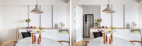 Um dos destaques do projeto é a cozinha aberta, que pode ser fechada quando necessário por meio de portas brancas em lambri de laca. Essa solução inovadora permite englobar ou isolar a cozinha da sala de jantar e da sala de estar conforme a ocasião, mantendo a versatilidade e a organização do espaço. Para completar, uma bancada fixa foi criada para as refeições rápidas, complementando a funcionalidade da cozinha.