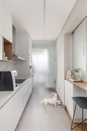 Localizado em Santos, no litoral paulista, o imóvel é um lar que harmoniza praticidade e elegância para a rotina de uma jovem médica pediatra e seu cãozinho da raça West Highland White Terrier. Para ganhar espaço, a integração da varanda ao apartamento foi uma solução inteligente na reforma. Por isso, as arquitetas da Memoá optaram pela instalação de cortinas de vidro no espaço anteriormente destinado à varanda, que foi incorporado à sala de estar, ampliando a área útil do apartamento e proporcionando uma sensação de maior amplitude, além de uma bela vista para a Praia do Gonzaga. “Essa integração melhorou a circulação dentro do apartamento. Junto com a escolha do piso, criamos uma sensação de continuidade entre os ambientes. Isso não só facilita o dia a dia, mas também torna o espaço mais agradável para receber visitas”, ressalta Tatiana Galiano.