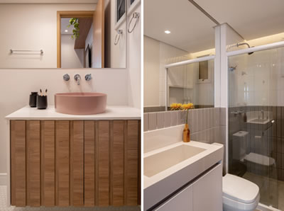 O banheiro também recebeu atenção especial, destacando-se pela cuba rosa que adiciona um charme especial ao ambiente. Esses pontos de cor sutis são cuidadosamente distribuídos pelo apartamento, trazendo vivacidade sem comprometer a atmosfera clean desejada pela moradora.