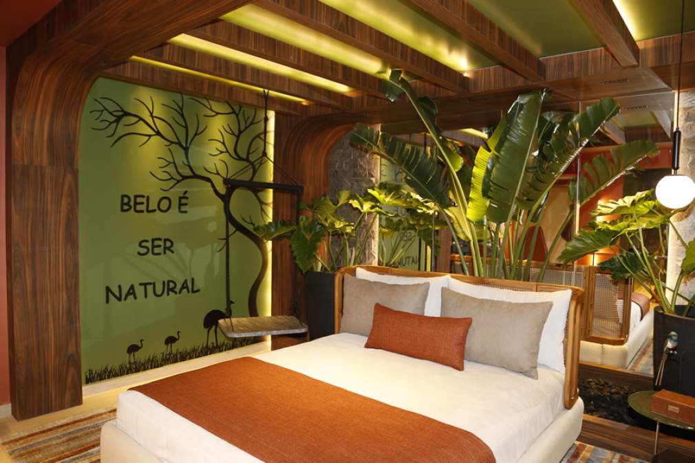 Inspirada pelo Parque Nacional das Emas em Goiás, a suíte master incorpora elementos naturais do parque, e inclui a integração de plantas no quarto, seguindo um conceito Urban Jungle, que é a tendência de utilizar plantas na decoração para purificar o ar, aumentar a imunidade e promover bem-estar.