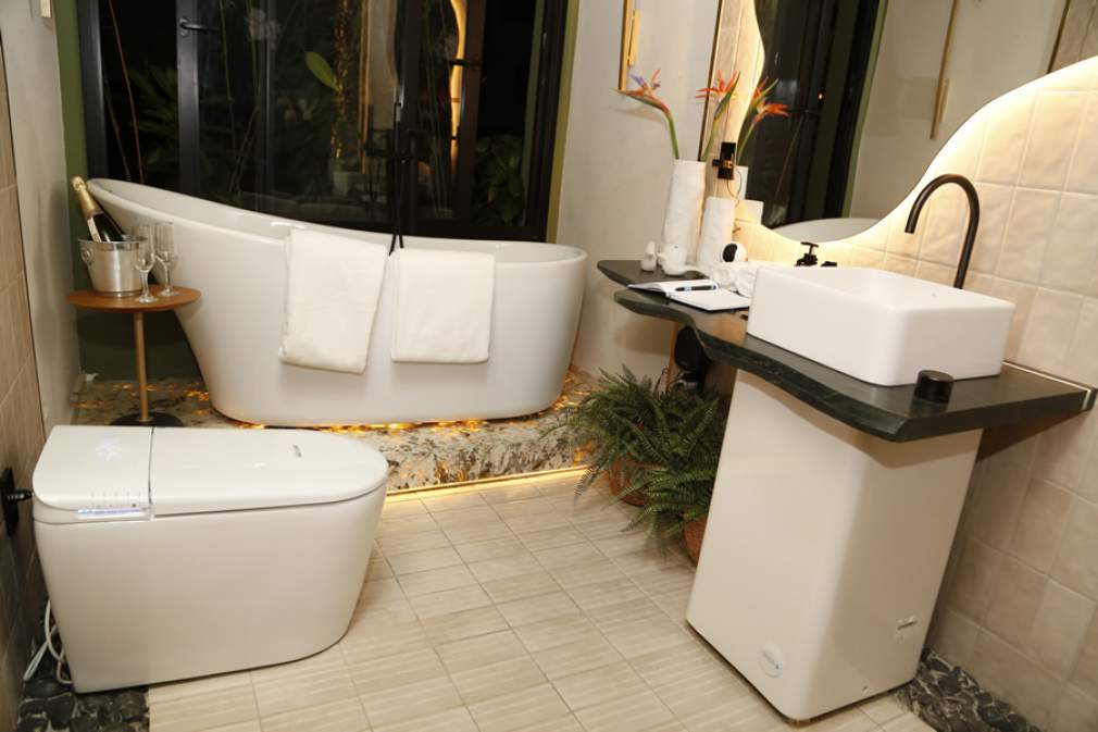Além da comodidade de ter dois chuveiros, o banheiro master da 10ª Morar Mais Goiânia traz modernidade, inovação e sofisticação. Um deles é o vaso sanitário tecnológico, que tem abertura e fechamento automático da tampa e do assento. O aparelho conta, ainda, com aquecimento do assento, duchinha automática para higienização pessoal e do próprio vaso, ar de secagem, e até luz UV para desinfecção após uso. Em caso de queda de energia, o vaso tem uma bateria que suporta até 150 descargas.
