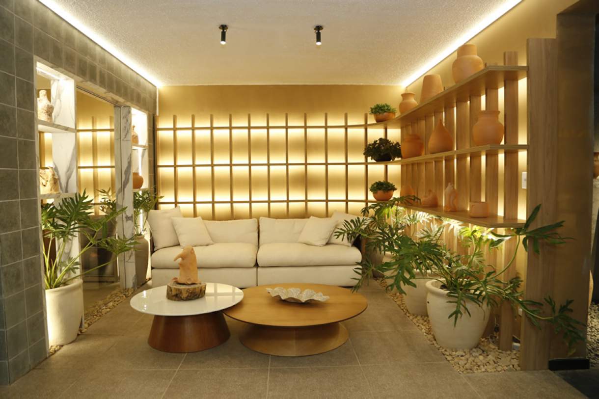 Cerâmicas e esculturas de barro - Forte referência herdada dos nossos povos originários, os vasos cerâmicos e as esculturas de barro trazem um diferencial decorativo único para a Sala de Negócios, ambiente projetado pelo arquiteto Edson Mesquita, para a Morar Mais Goiânia. Ao introduzir esses elementos naturais no ambiente, o autor do projeto não só adicionou uma estética original ao espaço, mas também reforçou a conexão com a natureza, trazendo acolhimento, para um ambiente muitas vezes talhado na objetividade e frieza das discussões de negócio.