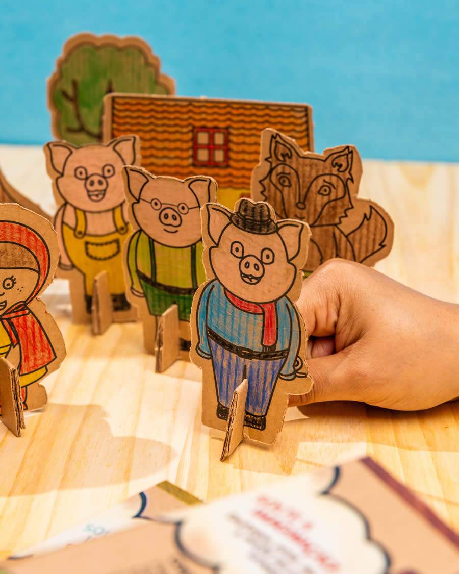 Entrando no tema, também pode ser adquirido o DPM (Destaque, Pinte e Monte) dos três porquinhos, cujo as peças vêm em cartelas de papelão que a criança destaca, pinta e monta, criando suas histórias do seu jeito.