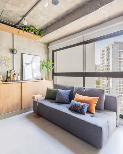 No canto da sala, o sofá cinza e a proximidade com o cantinho do bar | Projeto: Studio Guadix |Foto: Guilherme Pucci