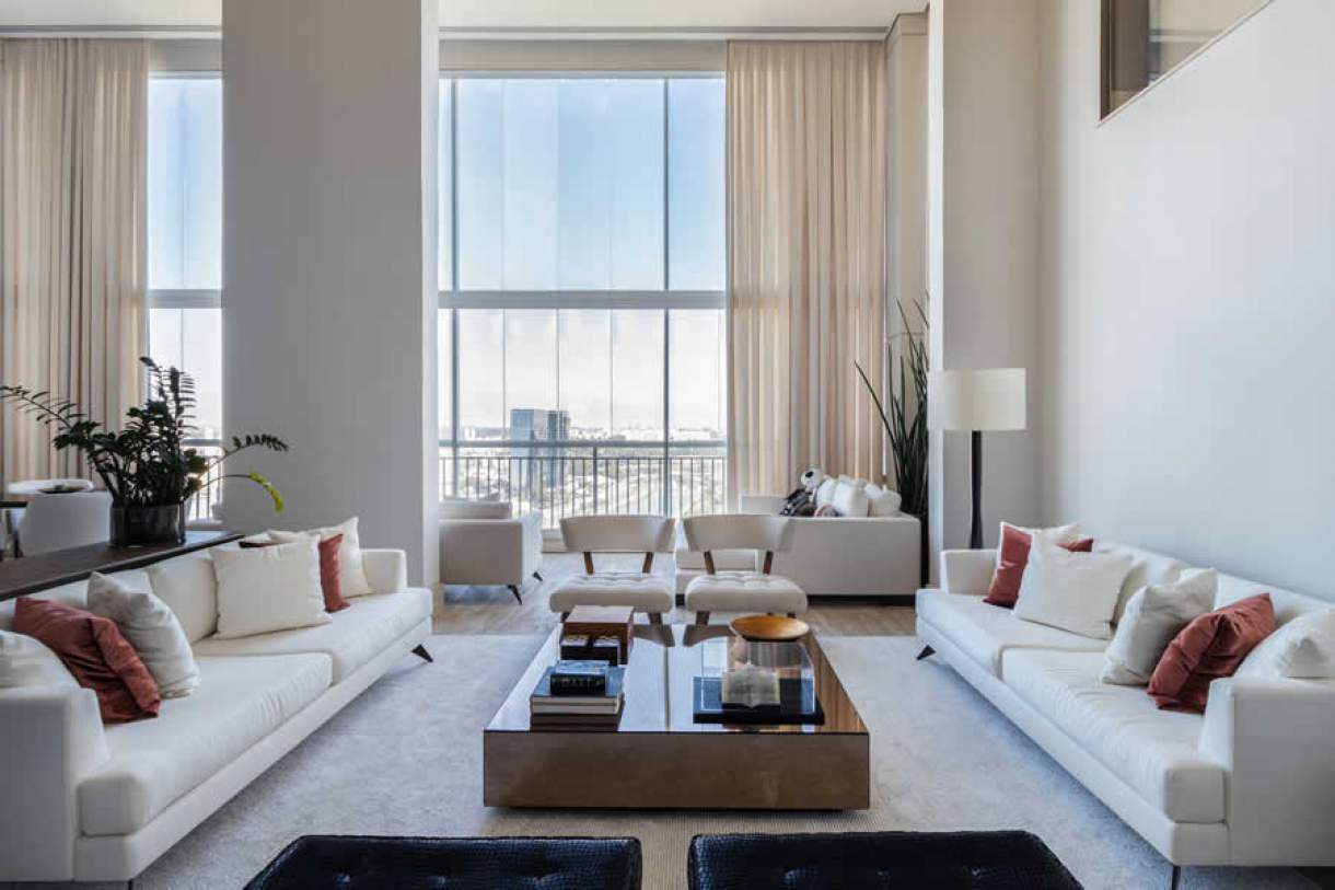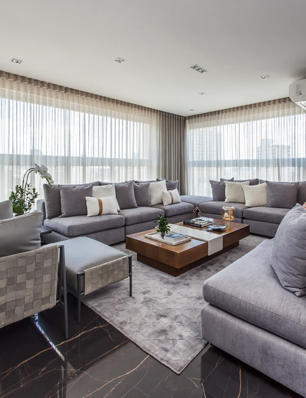 Nesta sala de estar assinada pelas arquitetas Danielle Dantas e Paula Passos, a presença da luz natural se faz presente mesmo com as cortinas instaladas em todo perímetro de vidro do imóvel | Projeto do escritório Dantas & Passos Arquitetura | Foto: Edu Pozella