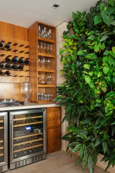 Ao lado da adega instalada na área social integrada do apartamento, o jardim vertical entrega um clima intimista ao possibilitar a interação de moradores e convidados com a natureza | Projeto do escritório Dantas & Passos Arquitetura | Foto: Maura Mello