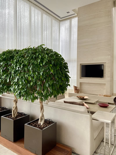 No entendimento das arquitetas, essa expressiva ligação com o natural tanto ocorre como a execução de jardins internos, o verde do paisagismo presente em uma área externa ou a vista para a cidade, por exemplo. “Esse processo também se dá quando trazemos cores como o verde, aa diversidade da terracota e materiais naturais como a própria madeira ou a pedra”, indica Paula.
