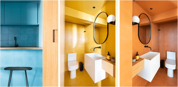 Neste imóvel, no Edifício Itália, no coração de São Paulo, cozinha e lavabos são monocromáticos, vibrantes e receberam ladrilhos hidráulicos com rejuntes imperceptíveis. Projeto da Rawi Arquitetura + Design | Fotos: Alexandre Disaro