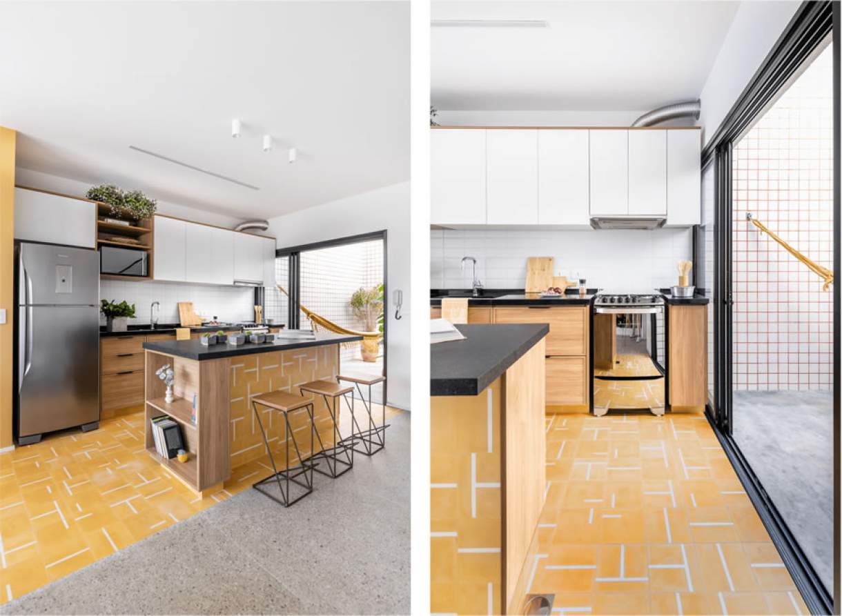 Nas propostas da Rawi Arquitetura + Design, esse material, que faz parte da história da arquitetura brasileira, compõem piso, bancada e parede com charme e inventividade