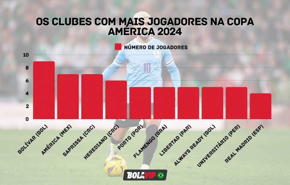A Copa América começa nesta quinta-feira (20) com o duelo entre Argentina e Canadá, às 21 horas. Ao todo, 229 clubes cederam jogadores à competição e há um brasileiro na relação dos dez primeiros, o Flamengo. O levantamento do Bolavip mostra o top 10 em número de atletas e o valor de mercado atualizado do grupo de jogadores enviados. Veja essas informações e outras curiosidades na lista abaixo:
