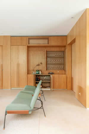 Nesse projeto, um pedido especial dos moradores: ao passo que desejavam ter uma adega, o casal compartilhou a preocupação com o acesso dos filhos pequenos. Como devolutiva, as arquitetas Vanessa Paiva e Claudia Passarini entregaram uma estrutura oculta na marcenaria | Projeto Paiva e Passarini Arquitetura | Foto: Xavier Neto