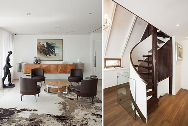 Nos projetos acima, a arquitetas Ieda e Carina Korman trabalharam com o marrom mais fechado nas poltronas do living (à esquerda) e na estrutura da escada espiral de um chalé em Campos do Jordão (à direita) | Projetos do escritório Korman Arquitetos | Foto: Gui Morelli