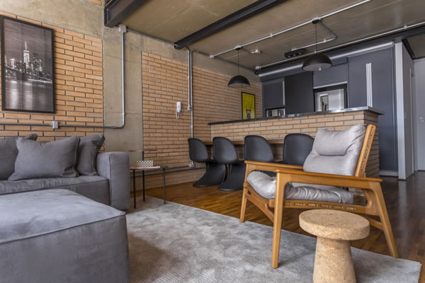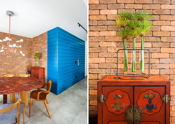 A paleta terrosa tomou conta do espaço deste loft, aparecendo nos detalhes do tampo da mesa oval, no armário antigo e até na parede de tijolinhos | Projeto do escritório Korman Arquitetos | Foto: Eduardo Pozella