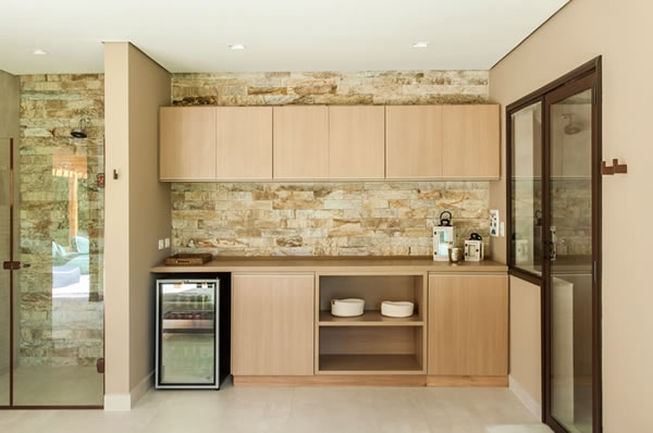 Para quem busca a criação de pontos de destaque no ambiente, essa cor pode ser utilizada como pano de fundo. Neste projeto, as arquitetas Carina e Ieda Korman mostram como o revestimento de pedra madeira, empregado para revestir a parede, se assemelha ao bege areia e propicia uma atmosfera rústica e relaxante | Projeto do escritório Korman Arquitetos | Foto: Eduardo Pozella
