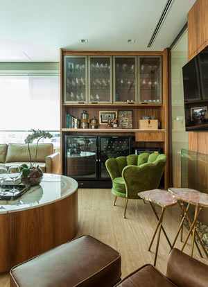 A poltrona em verde oliva é convidativa para os moradores ou as visitas se aconchegarem no living | Projeto do escritório Korman Arquitetos | Foto: Eduardo Pozella