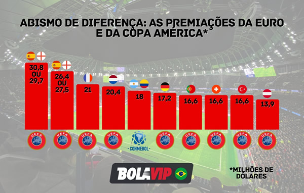 A diferença na premiação impacta todas as seleções. O Brasil, eliminado nas quartas de final da Copa América, receberá da Conmebol 4 milhões de dólares. Tchéquia, Polônia, Albânia e Escócia, seleções com a menor premiação da Eurocopa, receberam 10,6 milhões de dólares.