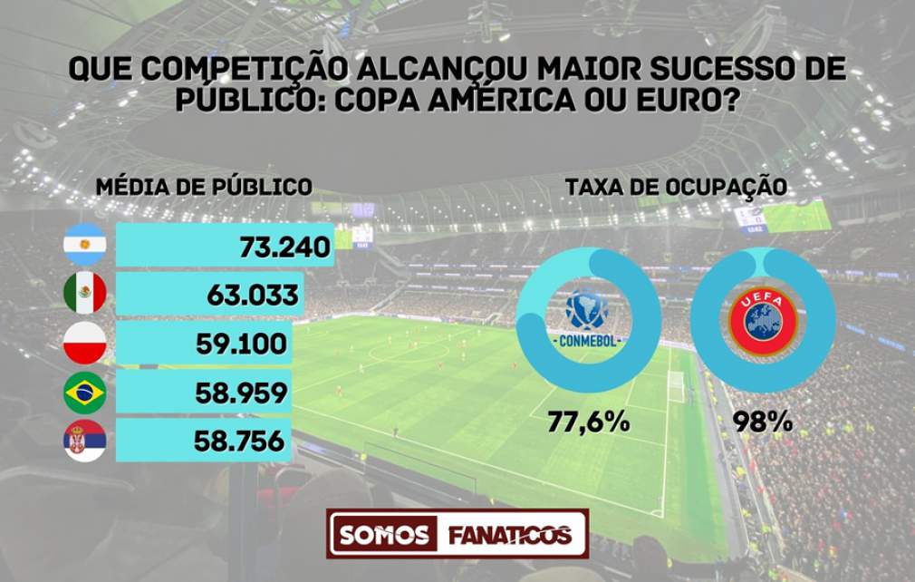 Foram compilados os públicos de todos os jogos da Copa América e Eurocopa, de acordo com o site O Gol e uefa.com, respectivamente. Para chegar às taxas de ocupação, foi somado a capacidade total dos estádios em comparação aos públicos das partidas.