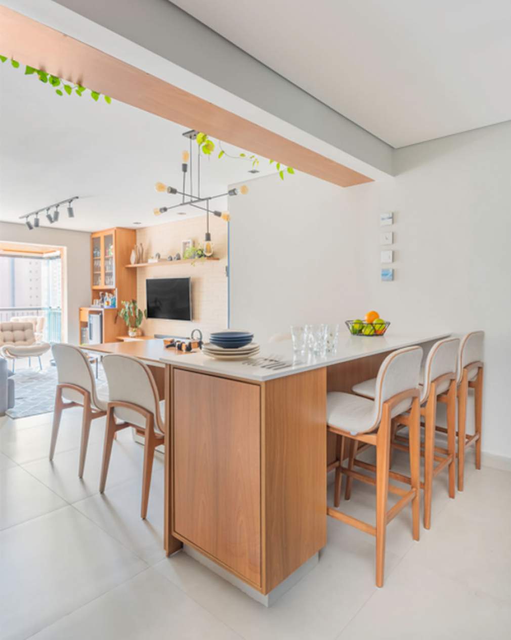 Se o ambiente está conectado à piscina ou poderá receber os moradores com roupas molhadas, o assento e encosto das banquetas altas devem ser feitos de um material impermeável e que, de preferência, seque rapidamente. “Entre os bons exemplos de materiais, temos a corda náutico, os tecidos Acquablock e com proteção contra água e raios-UV”, exemplifica Bruno Moraes.