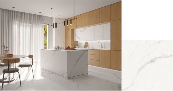 Neste espaço dedicado para receber a família e os amigos, a Série Calacata, da Incepa, é encontrada em 90 x 90 cm. Ela reveste piso, bancada e frontão da pia| Divulgação: Incepa