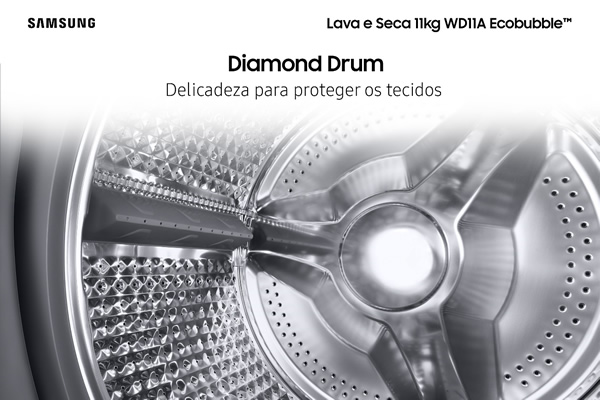 As máquinas lava e seca da linha 11kg, da Samsung, além de oferecer conectividade e economia, trazem o tambor Diamond Drum, que, como o nome sugere, traz pequenos relevos em formato de diamante no tambor para oferecer uma lavagem e secagem mais delicadas para as roupas, além de prevenir o atrito e impedir que desfiem durante o processo.