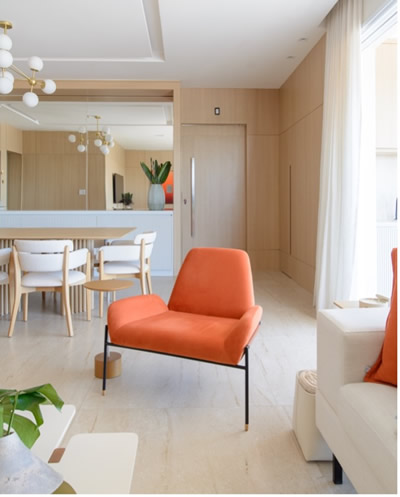 As poltronas também podem assumir o protagonismo pelo seu design e cor: nessa sala de estar, a arquiteta Leticia Nannetti trouxe a poltrona Lina da Lider interiores na cor laranja, como destaque na paleta de tons claros predominantes no projeto | Foto: Edson Ferreira