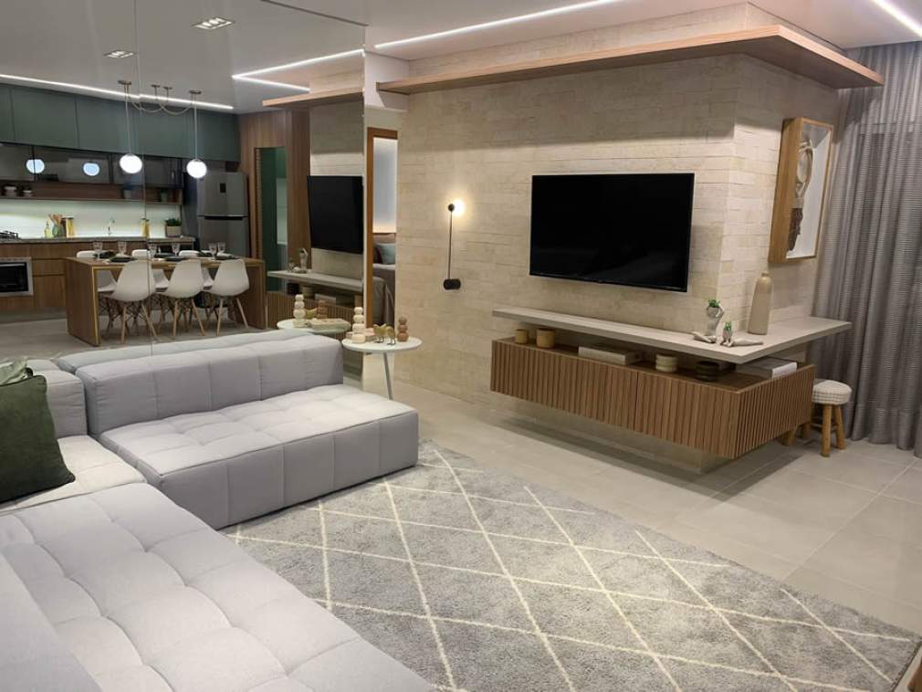 Mas será que é possível ter uma casa aconchegante, que atenda todas as necessidades do dia a dia, independente do tamanho? A arquiteta Aline Santos responde que sim. O caminho para isso é desenvolver ambientes integrados, ela explica. Foi esta estratégia que ela aplicou no apartamento decorado de três quartos do Golden Gate, com 76 m², o empreendimento mais recente do Eldorado Parque Bairro Pleno.