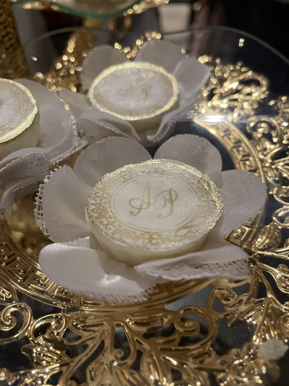 Cada doce é uma obra de arte, com a possibilidade de personalização, incluindo a estampa de iniciais dos noivos com tinta comestível e a miniatura do casal feita de açúcar.